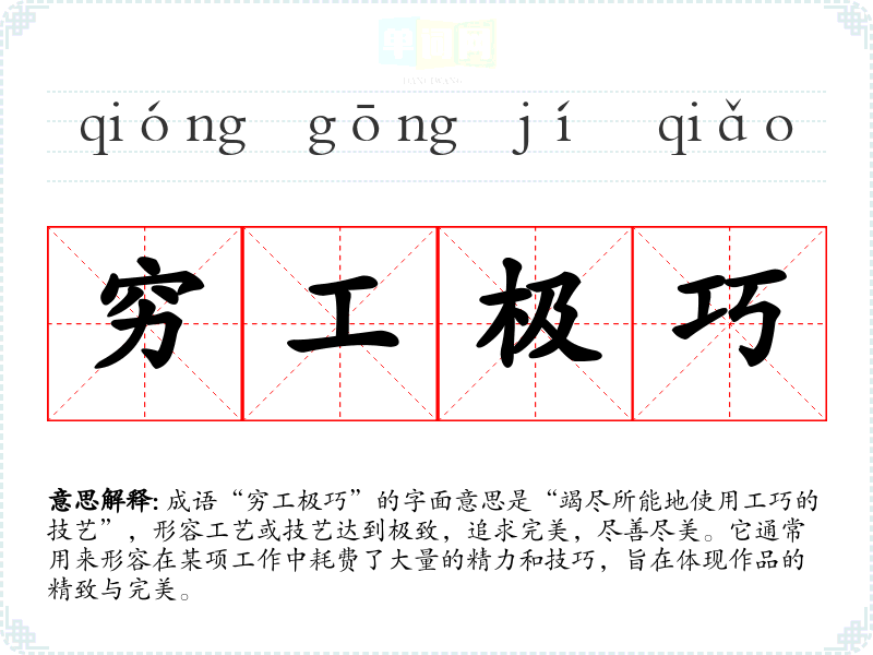 成语“穷工极巧”的字面意思是“竭尽所能地使用工巧的技艺”,形容工艺或技艺达到极致,追求完美,尽善尽美。它通常用来形容在某项工作中耗费了大量的精力和技巧,旨在体现作品的精致与完美。