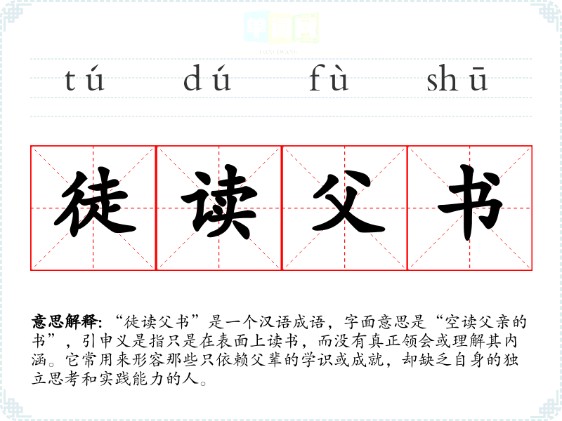 “徒读父书”是一个汉语成语,字面意思是“空读父亲的书”,引申义是指只是在表面上读书,而没有真正领会或理解其内涵。它常用来形容那些只依赖父辈的学识或成就,却缺乏自身的独立思考和实践能力的人。