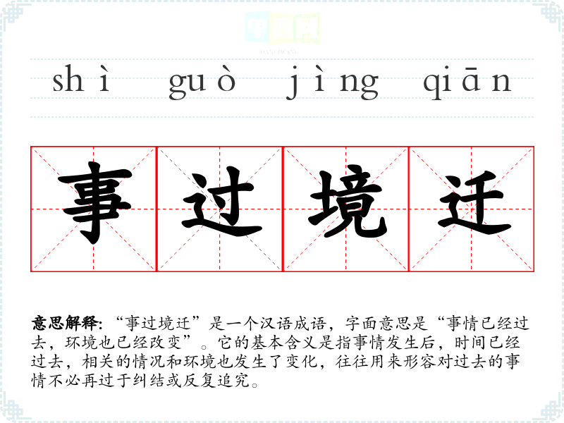 “事过境迁”是一个汉语成语,字面意思是“事情已经过去,环境也已经改变”。它的基本含义是指事情发生后,时间已经过去,相关的情况和环境也发生了变化,往往用来形容对过去的事情不必再过于纠结或反复追究。