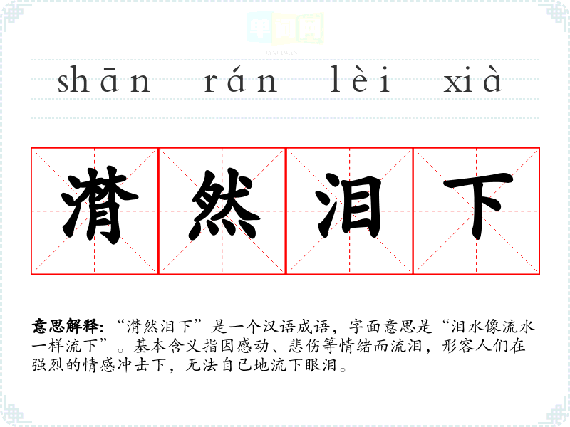“潸然泪下”是一个汉语成语,字面意思是“泪水像流水一样流下”。基本含义指因感动、悲伤等情绪而流泪,形容人们在强烈的情感冲击下,无法自已地流下眼泪。