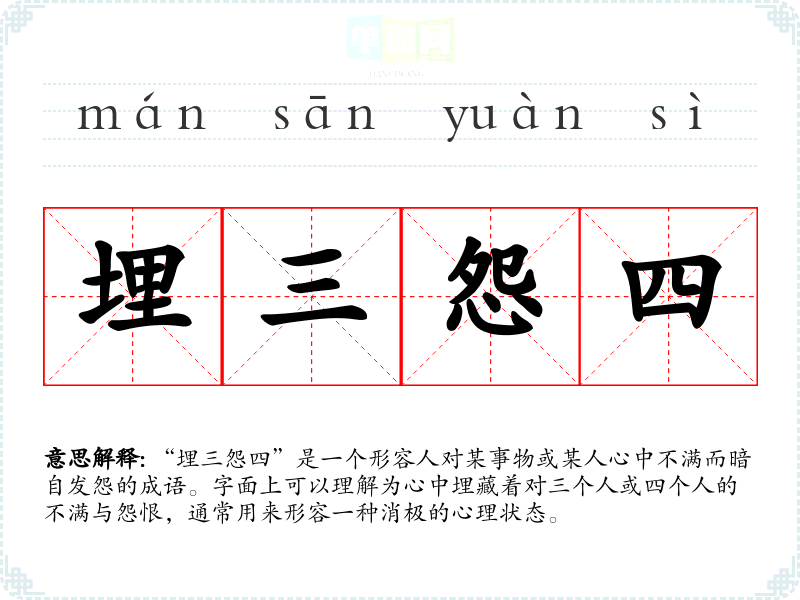 “埋三怨四”是一个形容人对某事物或某人心中不满而暗自发怨的成语。字面上可以理解为心中埋藏着对三个人或四个人的不满与怨恨,通常用来形容一种消极的心理状态。