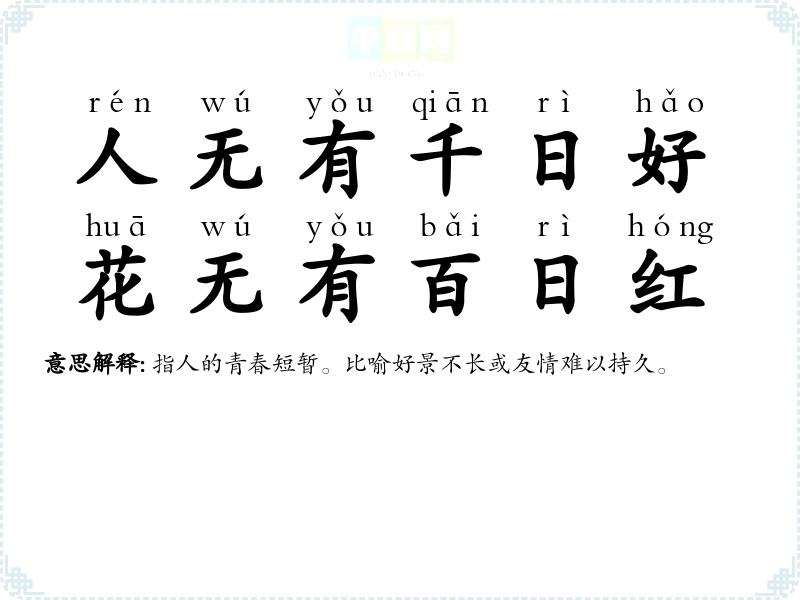 | 人无千日好,花无百日红 | 指人的青春短暂。比喻好景不长或友情难以持久。 |