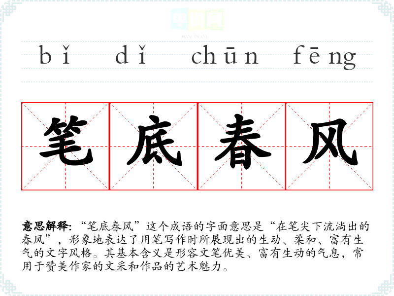 “笔底春风”这个成语的字面意思是“在笔尖下流淌出的春风”,形象地表达了用笔写作时所展现出的生动、柔和、富有生气的文字风格。其基本含义是形容文笔优美、富有生动的气息,常用于赞美作家的文采和作品的艺术魅力。