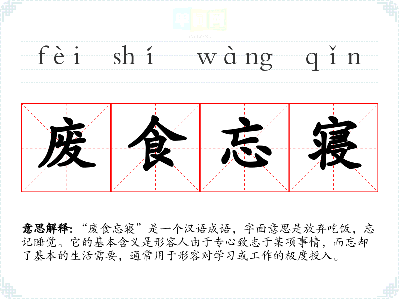 | 忘餐废寝 | 忘记了睡觉,顾不得吃饭。形容对某事专心致志或忘我地工作、学习。 |