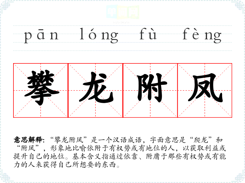 “攀龙附凤”是一个汉语成语,字面意思是“爬龙”和“附凤”,形象地比喻依附于有权势或有地位的人,以获取利益或提升自己的地位。基本含义指通过依靠、附庸于那些有权势或有能力的人来获得自己所想要的东西。