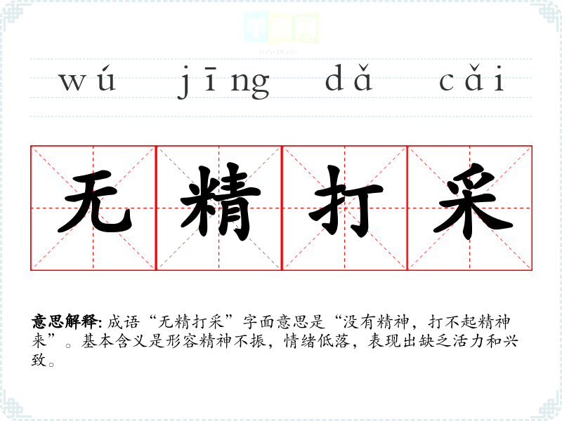 成语“无精打采”字面意思是“没有精神,打不起精神来”。基本含义是形容精神不振,情绪低落,表现出缺乏活力和兴致。