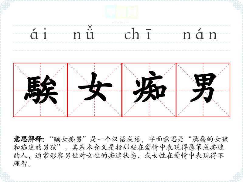 “騃女痴男”是一个汉语成语,字面意思是“愚蠢的女孩和痴迷的男孩”。其基本含义是指那些在爱情中表现得愚笨或痴迷的人,通常形容男性对女性的痴迷状态,或女性在爱情中表现得不理智。