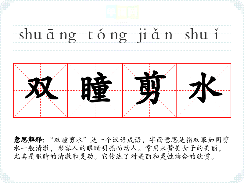 “双瞳剪水”是一个汉语成语,字面意思是指双眼如同剪水一般清澈,形容人的眼睛明亮而动人。常用来赞美女子的美丽,尤其是眼睛的清澈和灵动。它传达了对美丽和灵性结合的欣赏。