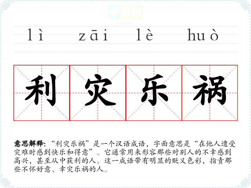 - 同义成语:幸灾乐祸:与“利灾乐祸”意思相近,强调在他人不幸中找到快乐。
