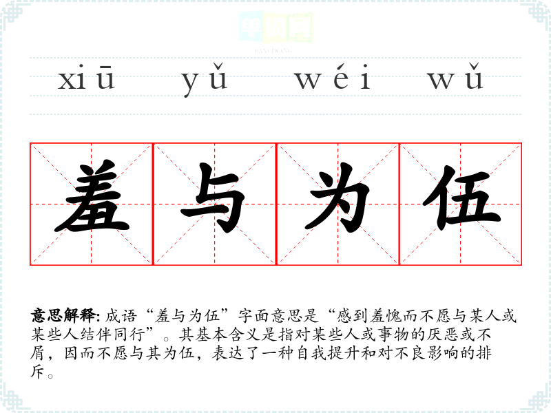 成语“羞与为伍”字面意思是“感到羞愧而不愿与某人或某些人结伴同行”。其基本含义是指对某些人或事物的厌恶或不屑,因而不愿与其为伍,表达了一种自我提升和对不良影响的排斥。