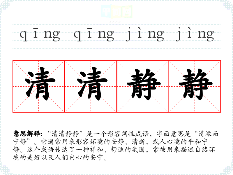 “清清静静”是一个形容词性成语,字面意思是“清澈而宁静”。它通常用来形容环境的安静、清新,或人心境的平和宁静。这个成语传达了一种祥和、舒适的氛围,常被用来描述自然环境的美好以及人们内心的安宁。