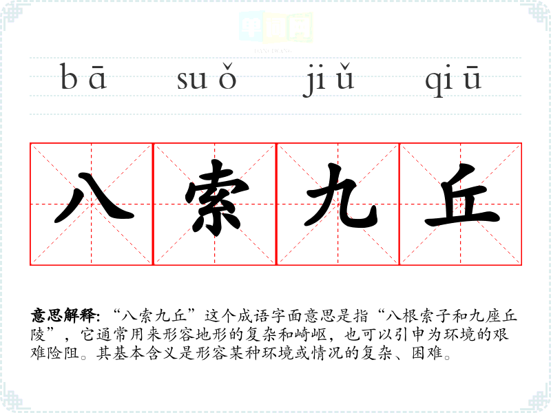 “八索九丘”这个成语字面意思是指“八根索子和九座丘陵”,它通常用来形容地形的复杂和崎岖,也可以引申为环境的艰难险阻。其基本含义是形容某种环境或情况的复杂、困难。