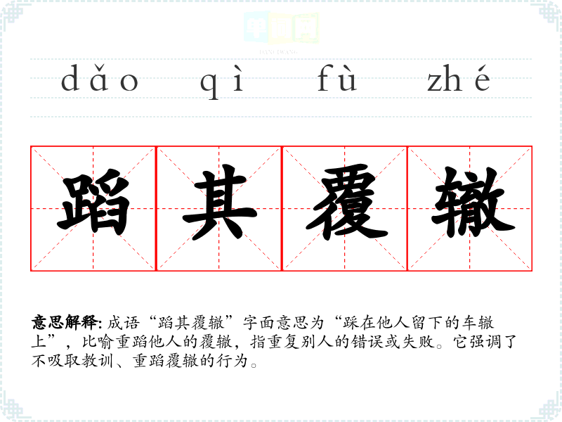 成语“蹈其覆辙”字面意思为“踩在他人留下的车辙上”,比喻重蹈他人的覆辙,指重复别人的错误或失败。它强调了不吸取教训、重蹈覆辙的行为。