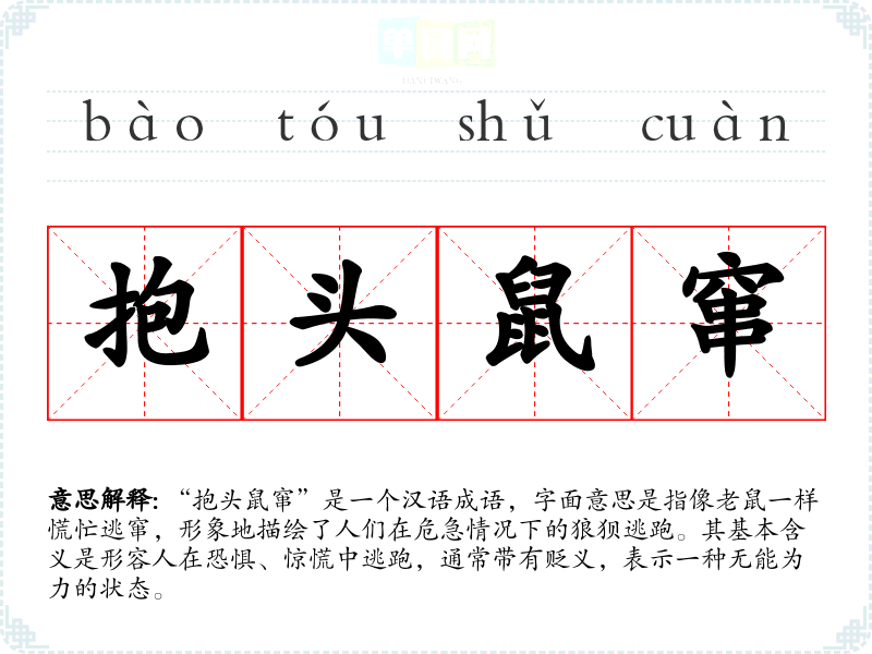 “抱头鼠窜”是一个汉语成语,字面意思是指像老鼠一样慌忙逃窜,形象地描绘了人们在危急情况下的狼狈逃跑。其基本含义是形容人在恐惧、惊慌中逃跑,通常带有贬义,表示一种无能为力的状态。