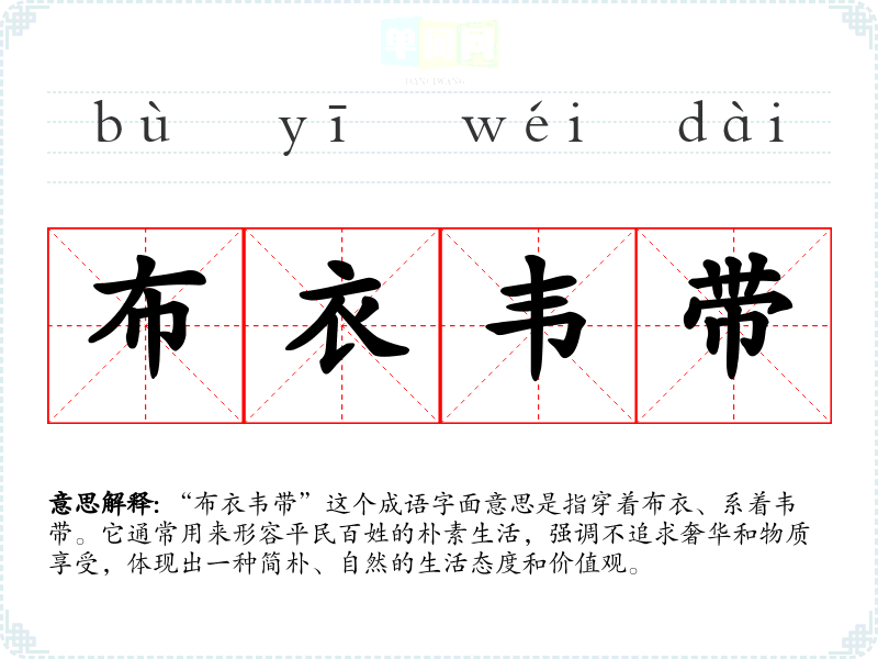 “布衣韦带”这个成语字面意思是指穿着布衣、系着韦带。它通常用来形容平民百姓的朴素生活,强调不追求奢华和物质享受,体现出一种简朴、自然的生活态度和价值观。