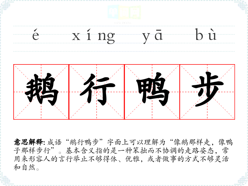 成语“鹅行鸭步”字面上可以理解为“像鹅那样走,像鸭子那样步行”。基本含义指的是一种笨拙而不协调的走路姿态,常用来形容人的言行举止不够得体、优雅,或者做事的方式不够灵活和自然。
