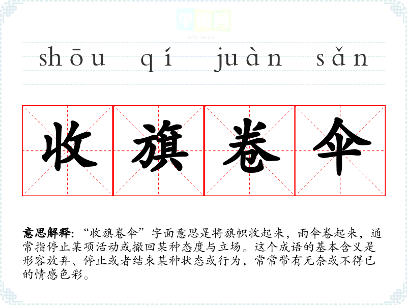 “收旗卷伞”字面意思是将旗帜收起来,雨伞卷起来,通常指停止某项活动或撤回某种态度与立场。这个成语的基本含义是形容放弃、停止或者结束某种状态或行为,常常带有无奈或不得已的情感色彩。