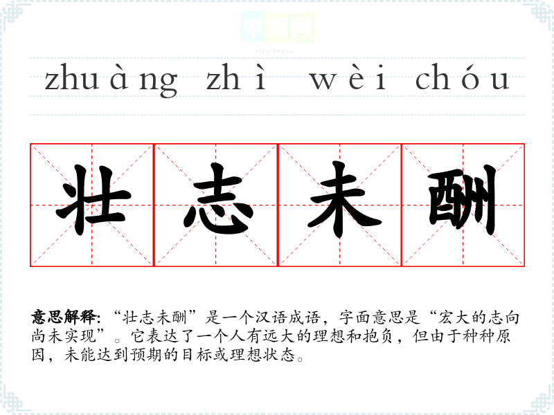 “壮志未酬”是一个汉语成语,字面意思是“宏大的志向尚未实现”。它表达了一个人有远大的理想和抱负,但由于种种原因,未能达到预期的目标或理想状态。