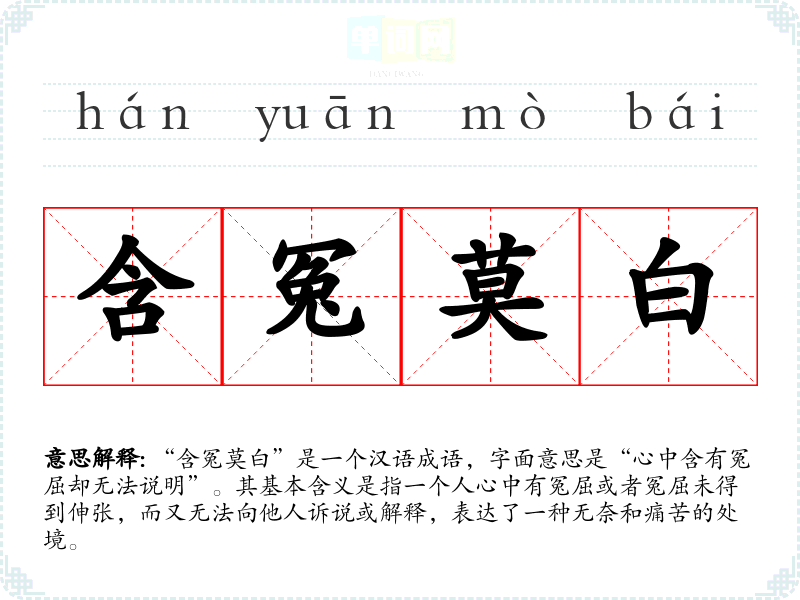 | 含冤莫白 | 含:包藏;莫:无处,无法;白:弄明白。指有冤屈无处申诉、无法昭雪。 |