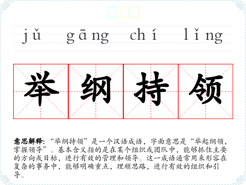 通过对“举纲持领”的学*,我认识到在任何工作或生活中,明确目标和方向的重要性。这不仅提升了我的语言表达能力,也让我在实际工作中更加注重思路的清晰性和有效性。这个成语将继续在我的生活和工作中发挥指导作用。