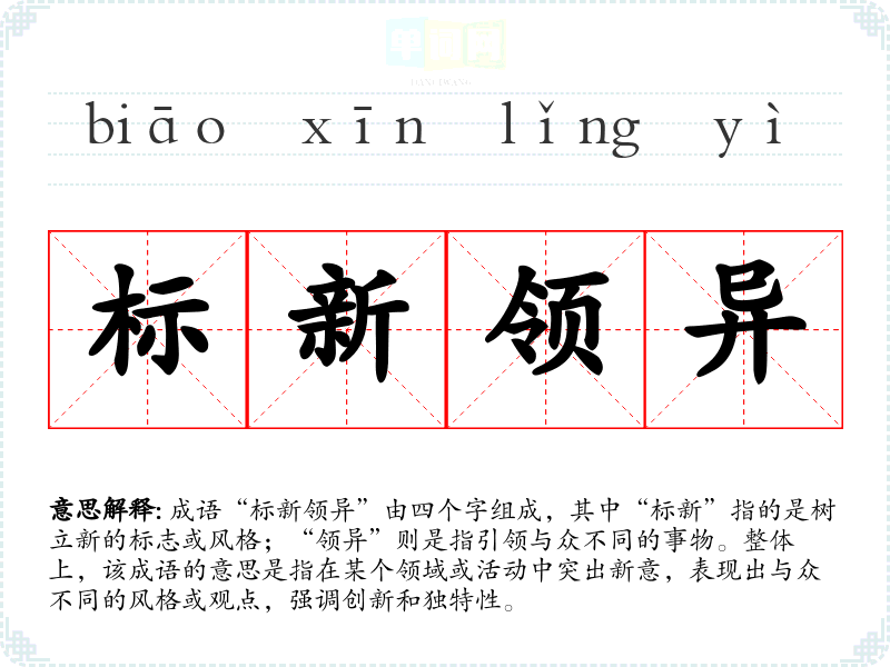 成语“标新领异”由四个字组成,其中“标新”指的是树立新的标志或风格;“领异”则是指引领与众不同的事物。整体上,该成语的意思是指在某个领域或活动中突出新意,表现出与众不同的风格或观点,强调创新和独特性。