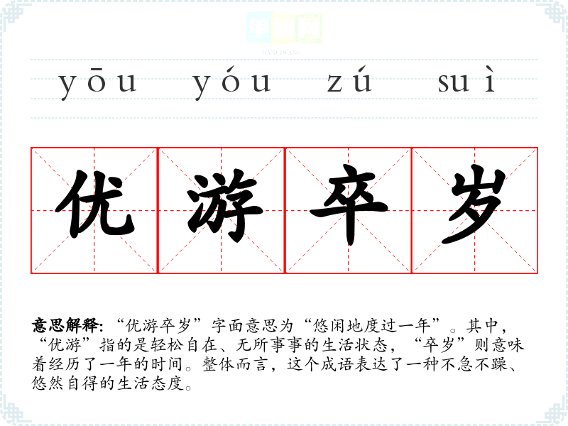 “优游卒岁”字面意思为“悠闲地度过一年”。其中,“优游”指的是轻松自在、无所事事的生活状态,“卒岁”则意味着经历了一年的时间。整体而言,这个成语表达了一种不急不躁、悠然自得的生活态度。