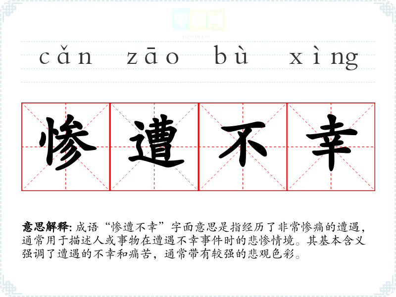 “惨遭不幸”并没有特定的历史典故或文学出处,属于现代汉语中常见的表达方式。该成语的构成词汇“惨”、“不幸”都具有强烈的负面情感色彩,反映了人们在面对苦难时的无奈与哀伤。