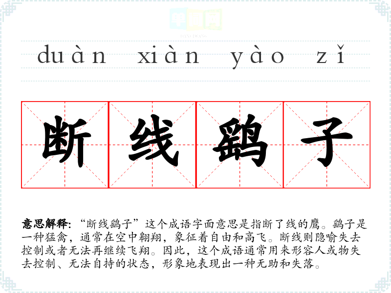 “断线鹞子”这个成语字面意思是指断了线的鹰。鹞子是一种猛禽,通常在空中翱翔,象征着自由和高飞。断线则隐喻失去控制或者无法再继续飞翔。因此,这个成语通常用来形容人或物失去控制、无法自持的状态,形象地表现出一种无助和失落。