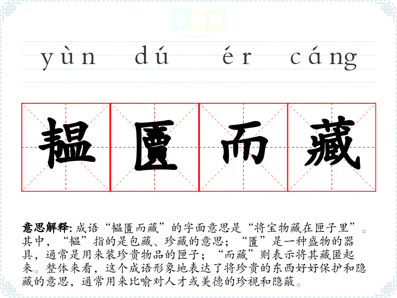 - 日常对话:可以用于形容某人对某种才华或物品的珍藏,比如说“他韫匵而藏自己的才华,待时而动。”