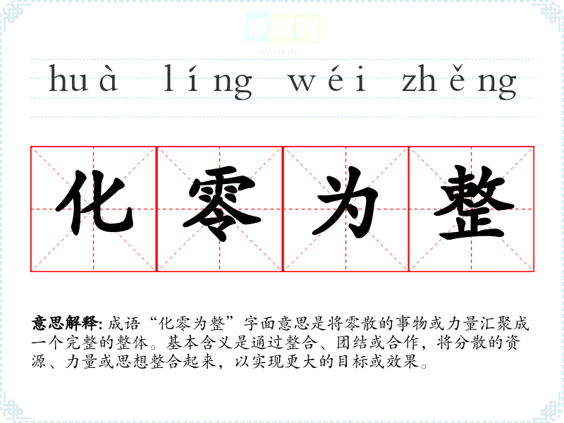 成语“化零为整”字面意思是将零散的事物或力量汇聚成一个完整的整体。基本含义是通过整合、团结或合作,将分散的资源、力量或思想整合起来,以实现更大的目标或效果。