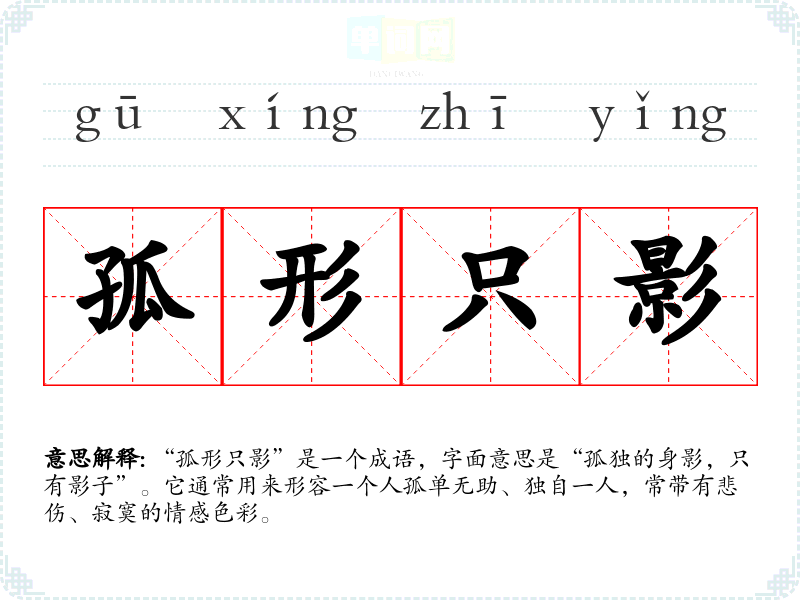 “孤形只影”是一个成语,字面意思是“孤独的身影,只有影子”。它通常用来形容一个人孤单无助、独自一人,常带有悲伤、寂寞的情感色彩。