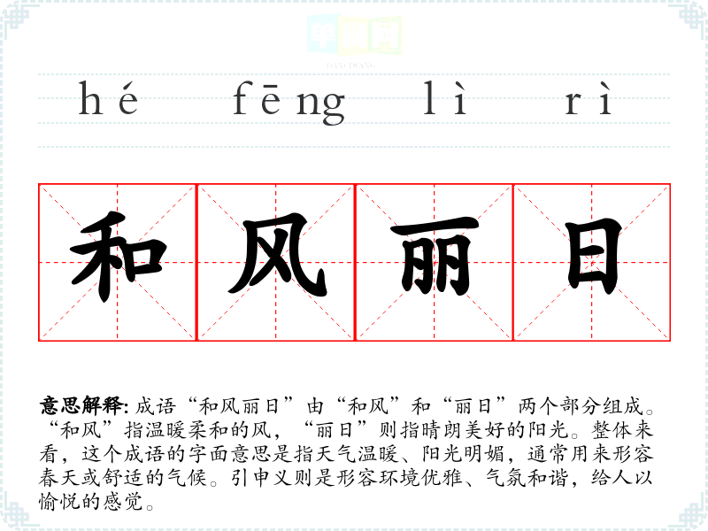 成语“和风丽日”由“和风”和“丽日”两个部分组成。“和风”指温暖柔和的风,“丽日”则指晴朗美好的阳光。整体来看,这个成语的字面意思是指天气温暖、阳光明媚,通常用来形容春天或舒适的气候。引申义则是形容环境优雅、气氛和谐,给人以愉悦的感觉。