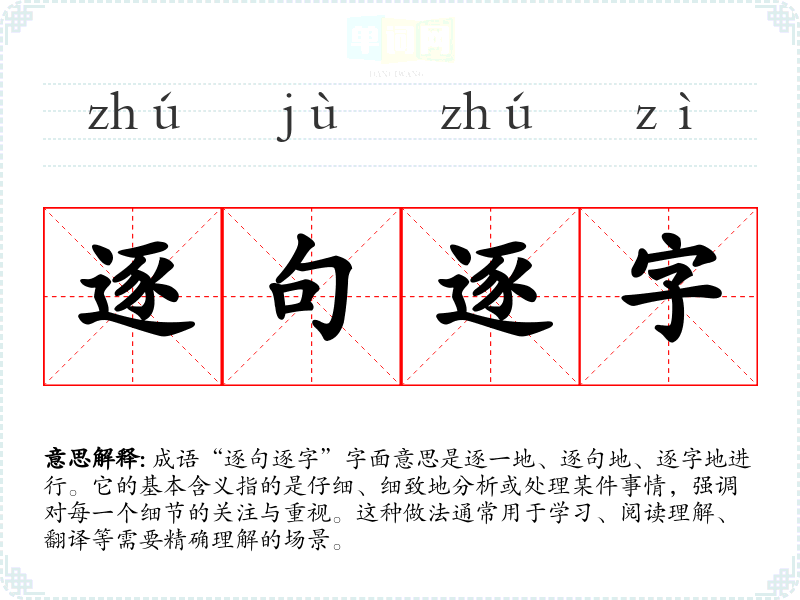 “逐句逐字”并没有明确的历史典故或文学出处,它的构成是由两个部分“逐句”和“逐字”组合而成。这个成语反映了汉语中对细致入微的重视,体现了**文化中对语言和文字的尊重与严谨。