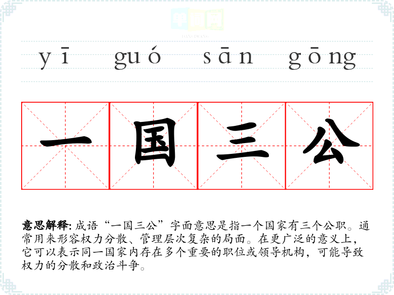 成语“一国三公”字面意思是指一个国家有三个公职。通常用来形容权力分散、管理层次复杂的局面。在更广泛的意义上,它可以表示同一国家内存在多个重要的职位或领导机构,可能导致权力的分散和政治斗争。