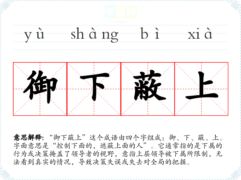 “御下蔽上”这个成语由四个字组成:御、下、蔽、上。字面意思是“控制下面的,遮蔽上面的人”。它通常指的是下属的行为或决策掩盖了领导者的视野,意指上层领导被下属所限制,无法看到真实的情况,导致决策失误或失去对全局的把握。