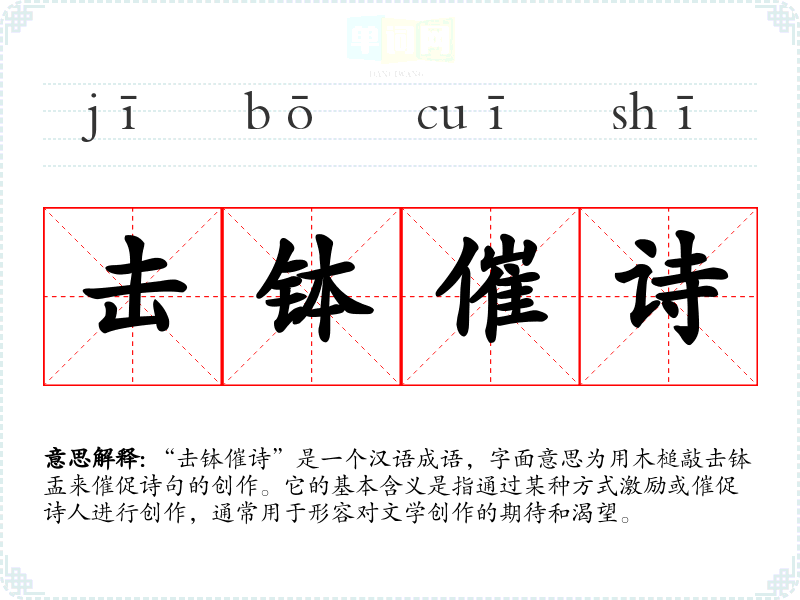 击钵催诗 指限时成诗。比喻诗才敏捷。