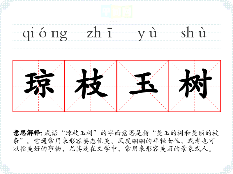 成语“琼枝玉树”的字面意思是指“美玉的树和美丽的枝条”。它通常用来形容姿态优美、风度翩翩的年轻女性,或者也可以指美好的事物,尤其是在文学中,常用来形容美丽的景象或人。