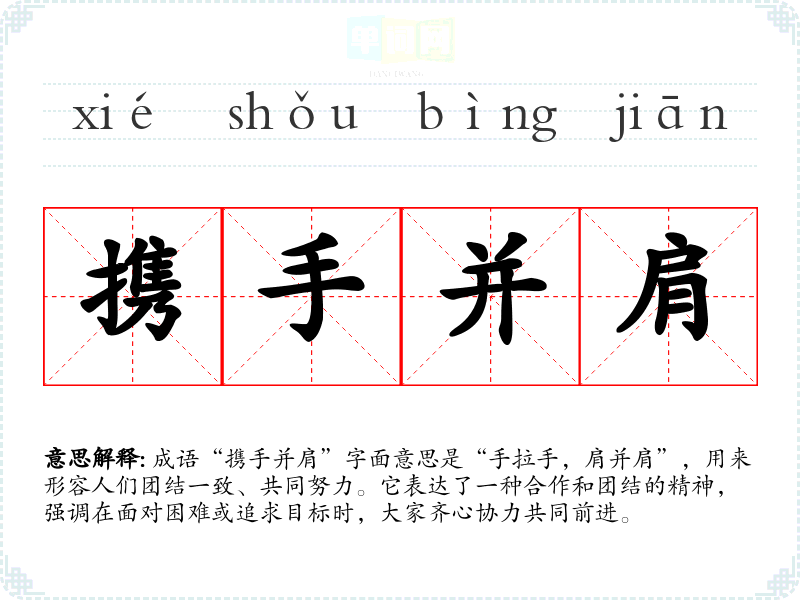 成语“携手并肩”字面意思是“手拉手,肩并肩”,用来形容人们团结一致、共同努力。它表达了一种合作和团结的精神,强调在面对困难或追求目标时,大家齐心协力共同前进。