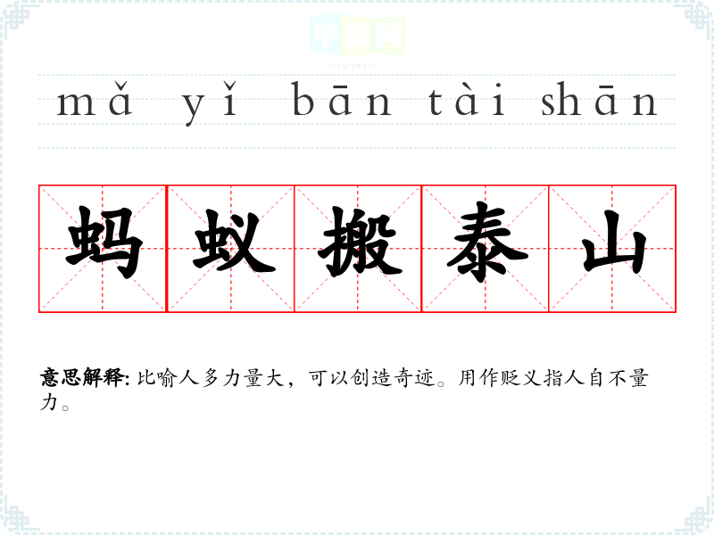 | 蚂蚁搬泰山 | 比喻人多力量大,可以创造奇迹。用作贬义指人自不量力。 |