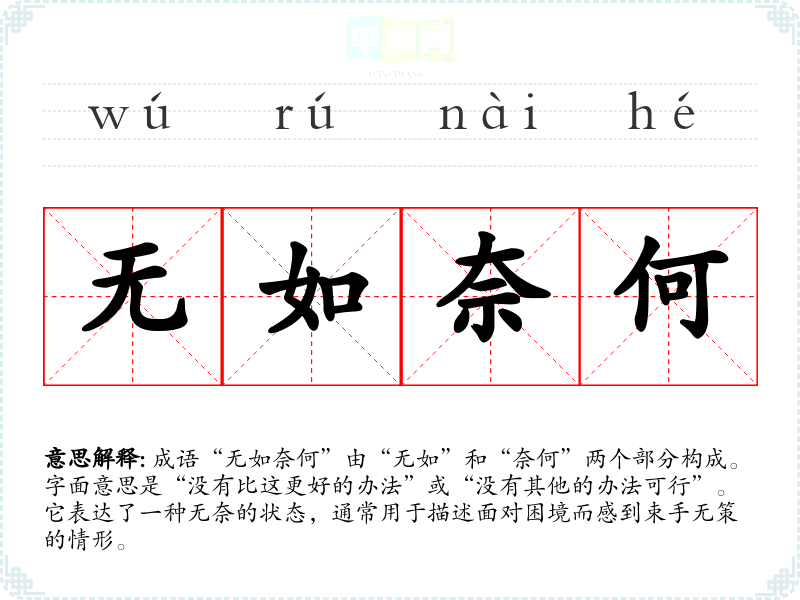 成语“无如奈何”由“无如”和“奈何”两个部分构成。字面意思是“没有比这更好的办法”或“没有其他的办法可行”。它表达了一种无奈的状态,通常用于描述面对困境而感到束手无策的情形。