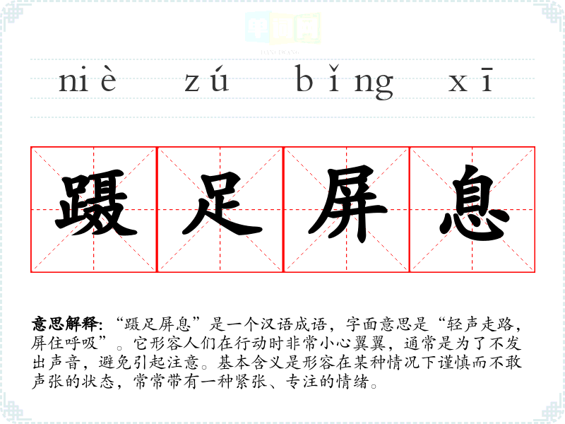 “蹑足屏息”是一个汉语成语,字面意思是“轻声走路,屏住呼吸”。它形容人们在行动时非常小心翼翼,通常是为了不发出声音,避免引起注意。基本含义是形容在某种情况下谨慎而不敢声张的状态,常常带有一种紧张、专注的情绪。