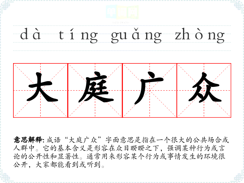 成语“大庭广众”字面意思是指在一个很大的公共场合或人群中。它的基本含义是形容在众目睽睽之下,强调某种行为或言论的公开性和显著性。通常用来形容某个行为或事情发生的环境很公开,大家都能看到或听到。