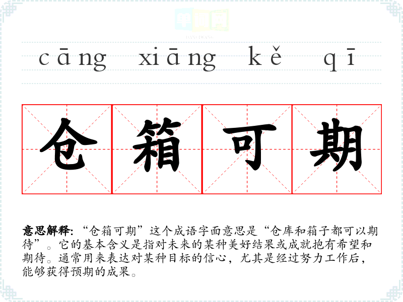 “仓箱可期”这个成语字面意思是“仓库和箱子都可以期待”。它的基本含义是指对未来的某种美好结果或成就抱有希望和期待。通常用来表达对某种目标的信心,尤其是经过努力工作后,能够获得预期的成果。