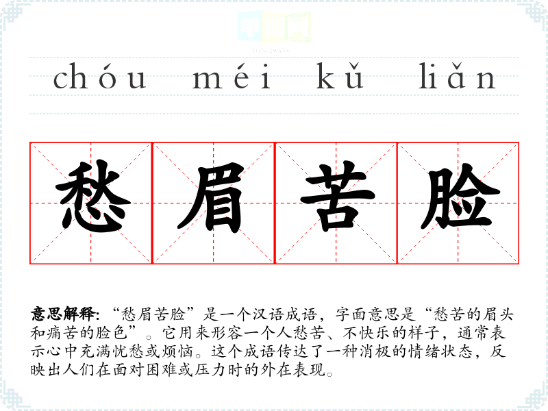 “愁眉苦脸”是一个汉语成语,字面意思是“愁苦的眉头和痛苦的脸色”。它用来形容一个人愁苦、不快乐的样子,通常表示心中充满忧愁或烦恼。这个成语传达了一种消极的情绪状态,反映出人们在面对困难或压力时的外在表现。