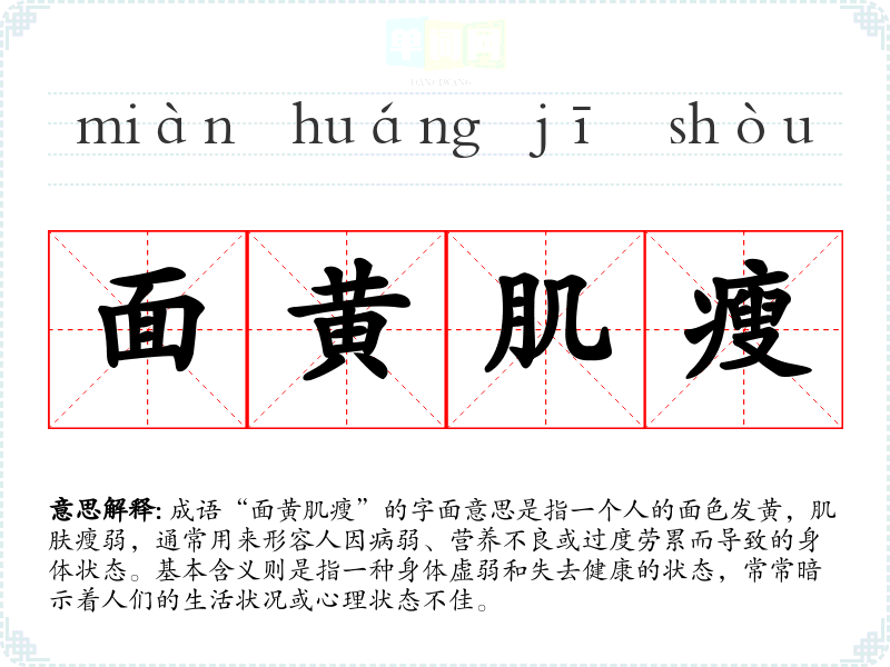 这个成语通常带有一种忧伤和关切的情感联想,常常引发人们对健康、生活质量的思考。看到“面黄肌瘦”的人,往往会让人感到同情和关心,提醒我们重视自己的健康。