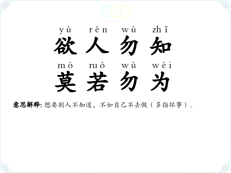 | 欲人勿知,莫若勿为 | 想要别人不知道,不如自己不去做(多指坏事)。 |