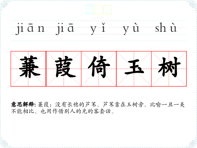 蒹葭:没有长穗的芦苇。芦苇靠在玉树旁。比喻一丑一美不能相比。也用作借别人的光的客套话。