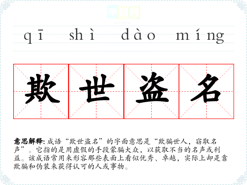 成语“欺世盗名”的字面意思是“欺骗世人,窃取名声”。它指的是用虚假的手段蒙骗大众,以获取不当的名声或利益。该成语常用来形容那些表面上看似优秀、卓越,实际上却是靠欺骗和伪装来获得认可的人或事物。