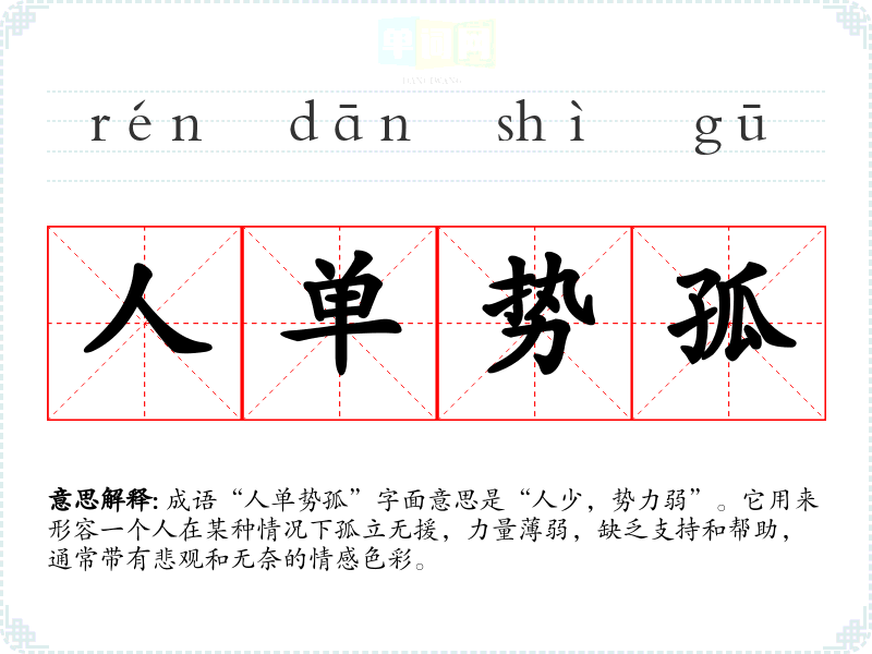 “人单势孤”带给我一种孤独和无奈的感觉,仿佛在表达一种对支持和帮助的渴望。这种情感可以引发对人际关系和社会支持网络的思考,提醒我们在生活中多关注身边的人,给予他们支持和帮助。
