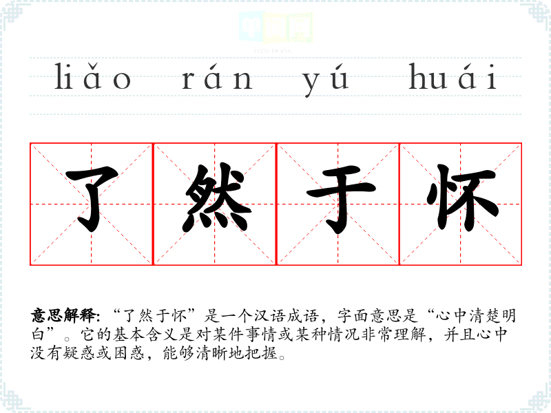 “了然于怀”是一个汉语成语,字面意思是“心中清楚明白”。它的基本含义是对某件事情或某种情况非常理解,并且心中没有疑惑或困惑,能够清晰地把握。
